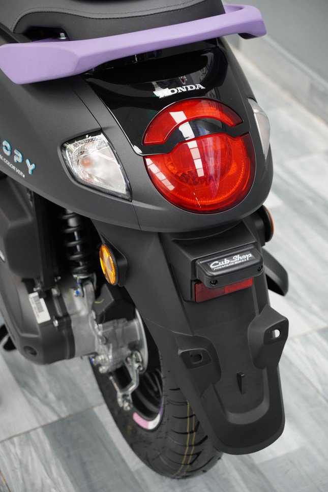 Đèn hậu tròn thiết kế tương đồng với mặt trước. Tay dắt được sơn tím, còn các đèn xi-nhan halogen đặt tách rời.