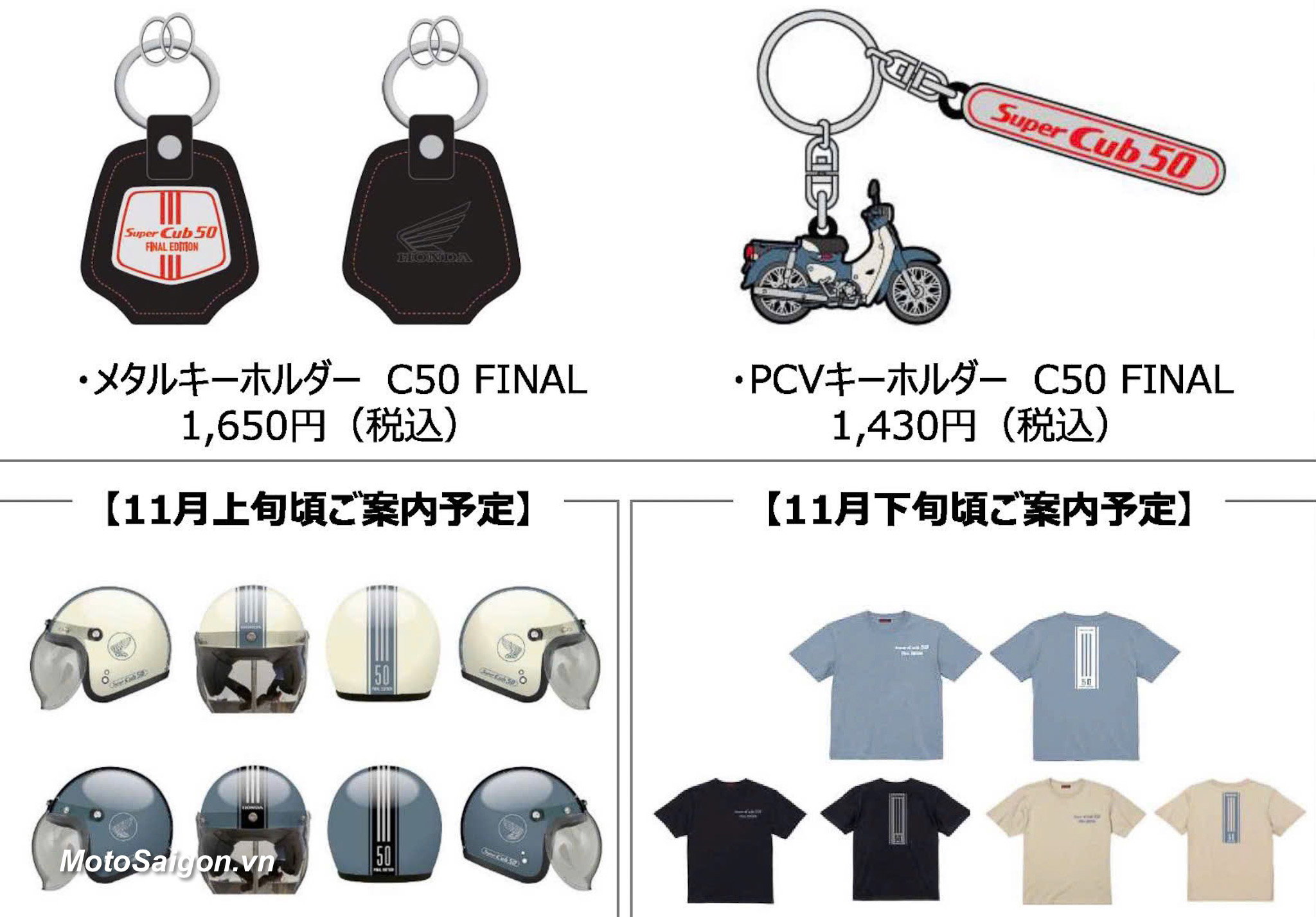 Super Cub 50 Final Edition về Việt Nam kèm bộ quà tặng độc đáo đáng giá dành cho chủ nhân xe gồm: Nón bảo hiểm, áo thun T-Shirt, móc khoá, ốp chìa khoá cũng được thiết kế tem và màu sắc đúng với màu của Super Cub 50 Final Edition.